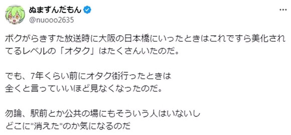 「以前在《幸运☆星》播映的时候,我在大阪日本桥看到的『宅宅』的夸张程度,都会觉得这些图片有美化过了。但是我7年前去宅宅街的时候,这种人几乎可以说完全消失了。车站前或其他公共场所也完全看不到这种人,真好奇他们究竟『消失』到哪里去了啊?」